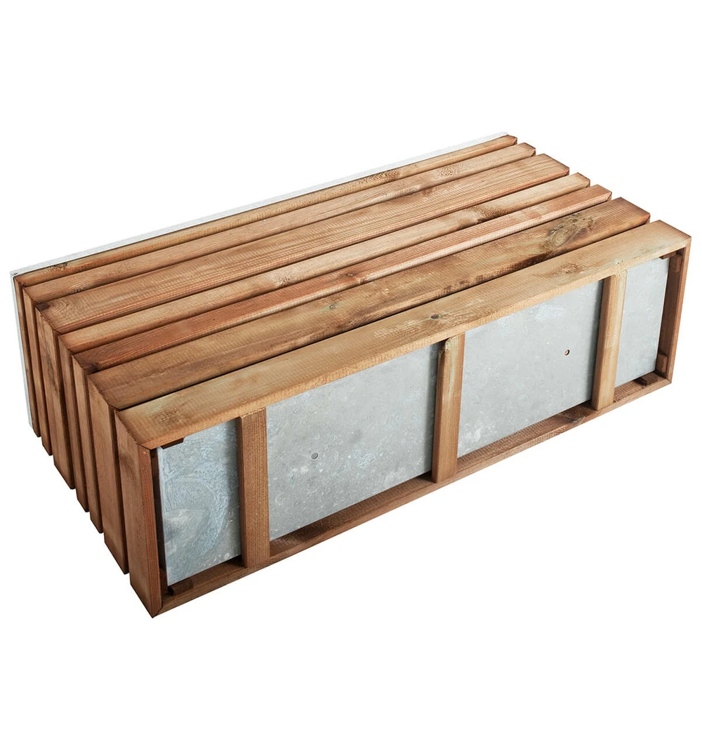 le bac est constituĂ© de lamelles de pin europĂ©en assemblĂ© par des vis, d’acier Ă l’intĂ©rieur du bac.
