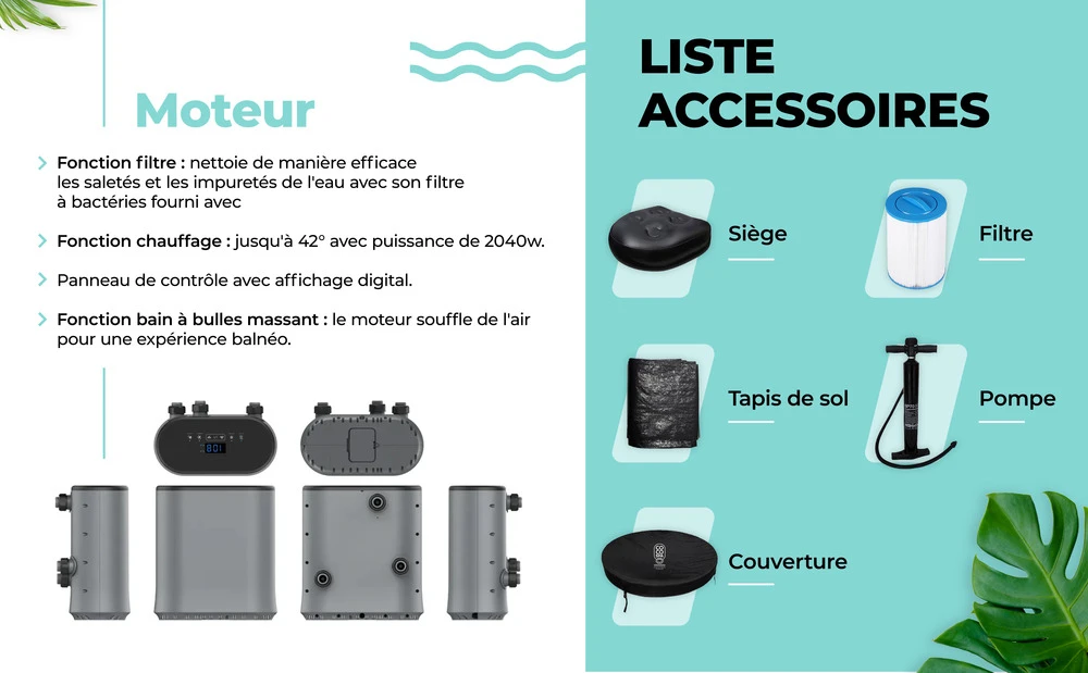 l’installation de ce spa gonflable est un jeu d’enfant. Il suffit de le déballer, de le gonfler et de le remplir d’eau pour commencer à en profiter. Un système de filtration intégré et une couverture isolante sont inclus pour préserver la qualité de l’eau et maintenir la température souhaitée. De plus, un tapis de sol et un gonfleur électrique sont fournis pour faciliter davantage l’installation.