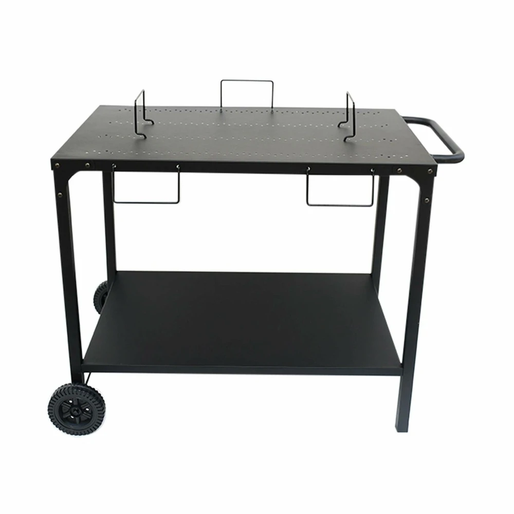cette desserte d’extérieur en acier noir est très pratique, elle peut être utilisée comme support de plancha ou pour accueillir vos plats et ustensiles. Pour cela, il suffit de déplacer les crochets d’attache qui se positionnent dans les trous du plateau du haut. Les 5 crochets livrés avec la desserte noire peuvent également être placés sur le côté pour accrocher vos ustensiles de cuisines, torchons etc. De plus, cette desserte d’extérieur se déplace très facilement grâce à sa poignée et ses deux roues, vous pouvez donc la laisser dehors en été mais aussi l’utiliser en intérieur quand bon vous semble. La desserte est également dotée d’un plateau inférieur où vous pourrez ranger la bonbonne de gaz de votre plancha, des plats ou des ustensiles.