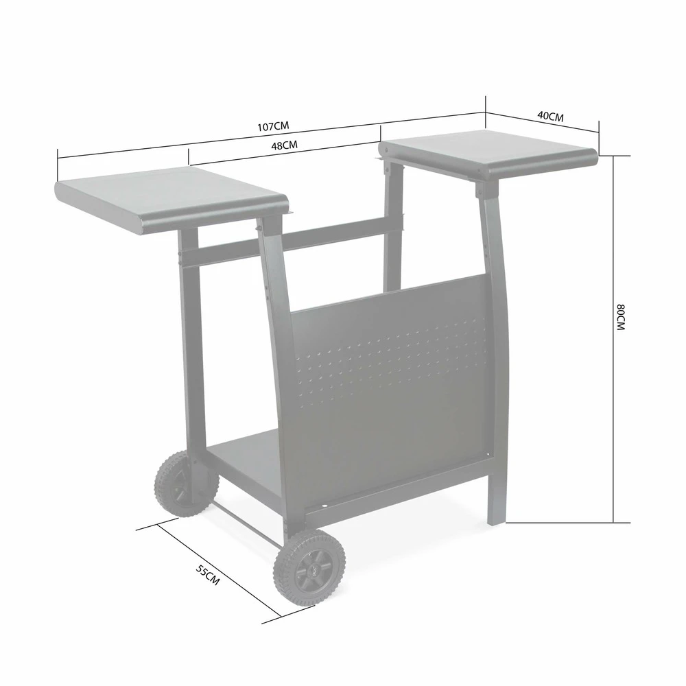 Le chariot pour plancha est doté de deux tablettes pour poser ustensiles et plats ainsi que d’une tablette inférieure, qui accueillera la consigne de gaz.