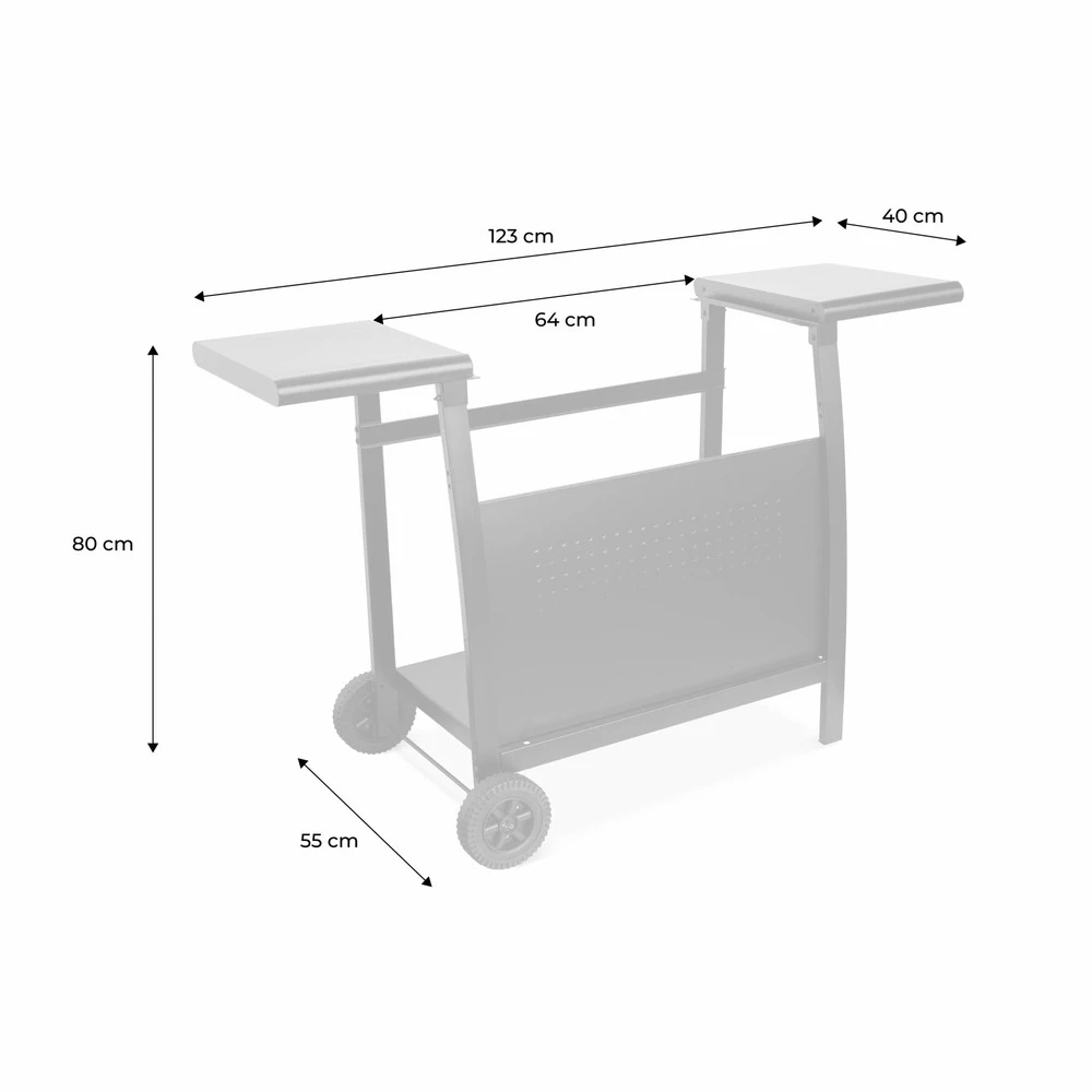 Le chariot pour plancha est doté de deux tablettes pour poser ustensiles et plats ainsi que d’une tablette inférieure, qui accueillera la consigne de gaz.