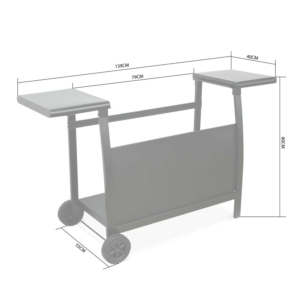 Le chariot pour plancha est doté de deux tablettes pour poser ustensiles et plats ainsi que d’une tablette inférieure, qui accueillera la consigne de gaz.