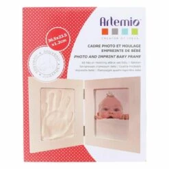 Kit cadre photo 12 x 17 cm avec moulage empreinte. Inclut : cadres, sachet de plâtre, instruction. Plongez le sachet fermé dans un récipient rempli d’eau chaude (30 à 40°c). Retirez la pâte du sachet et pétrissez 5 à 10 minutes (si nécessaire, ajoutez quelques gouttes d’eau). Dans le cadre sans vitre, pressez la pâte et lissez-la avec les doigts ou le dos d’une cuillère. Savonnez-vous les mains afin d’enlever tous les résidus de pâte. Placez le pied ou la main de l’enfant (ou la patte de chien ou de chat) sur la pâte. Afin de bien marquer toute l’empreinte, appuyez 20 secondes pour les doigts et 20 secondes pour la paume. Lavez soigneusement la main ou le pied afin d’enlever tous les résidus de pâte. Laissez sécher 2 à 3 jours (la pâte aura légèrement rétréci). Peignez le cadre à la peinture acrylique. Les dimensions sont de 36,5 x 23,5 cm.