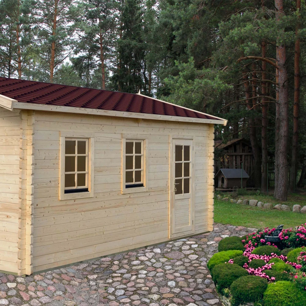 informations complémentaires : garage en madriers mi-bois , biseautés , doubles rainures , bruts à lasurer de 44 m/m , bois provenance europe du nord , porte double 240 x 213 cm , 1 porte simple 87 x 189 cm 1/2 vitrée , 2 fenêtres simples 72.5 x 94.5 cm , ferrures et serrure à barillet , voliges de 18 m/m , hauteur des murs 229 cm , hauteur au faitage 290 cm , vitrage verre , toiture en bardeaux bitumeux noirs