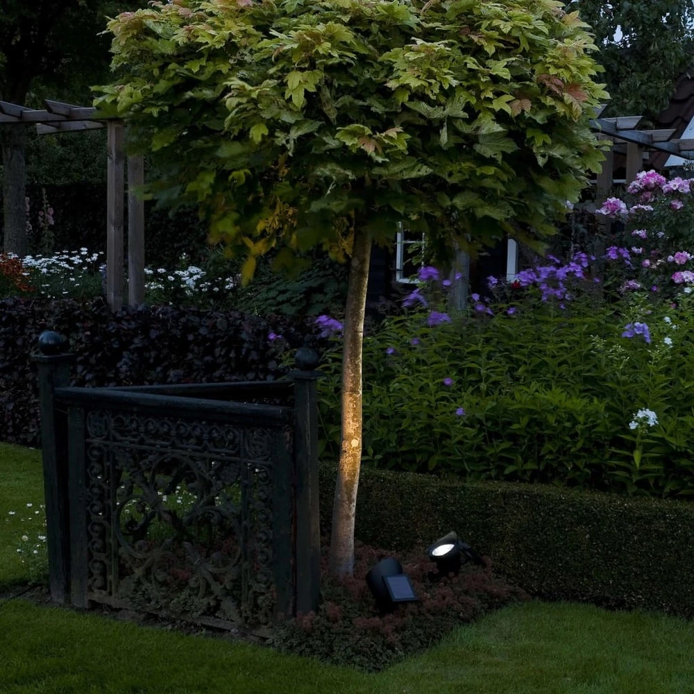 Le jeu de projecteurs solaires lazise de luxform est un jeu de 2 lampes de jardin qui rassemble l’Ă©nergie directement du soleil et crĂ©era une atmosphère magnifique dans votre jardin ! Tout ce dont vous avez besoin est suffisamment de lumière solaire pour charger la batterie nimh de 1,2 v remplaçable via le panneau solaire. Au crĂ©puscule, les lampes s’allument automatiquement. Selon le nombre d’heures de soleil ce jour-lĂ , les lampes Ă©clairent pendant environ 6 heures. Avec le piquet de sol fourni, les lampes peuvent ĂŞtre facilement fixĂ©es sur les surfaces pavĂ©es et non pavĂ©es.