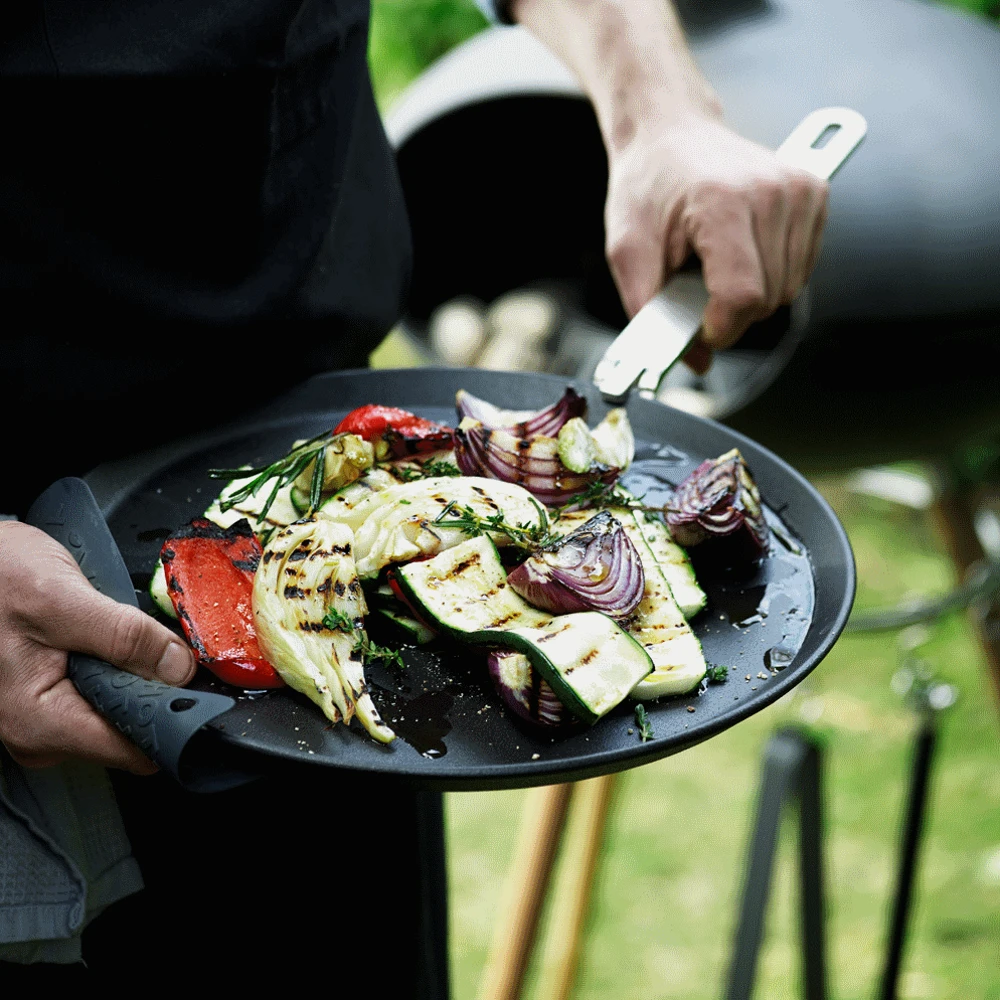 La plancha / poêle à frire est faite en fonte émaillée et la