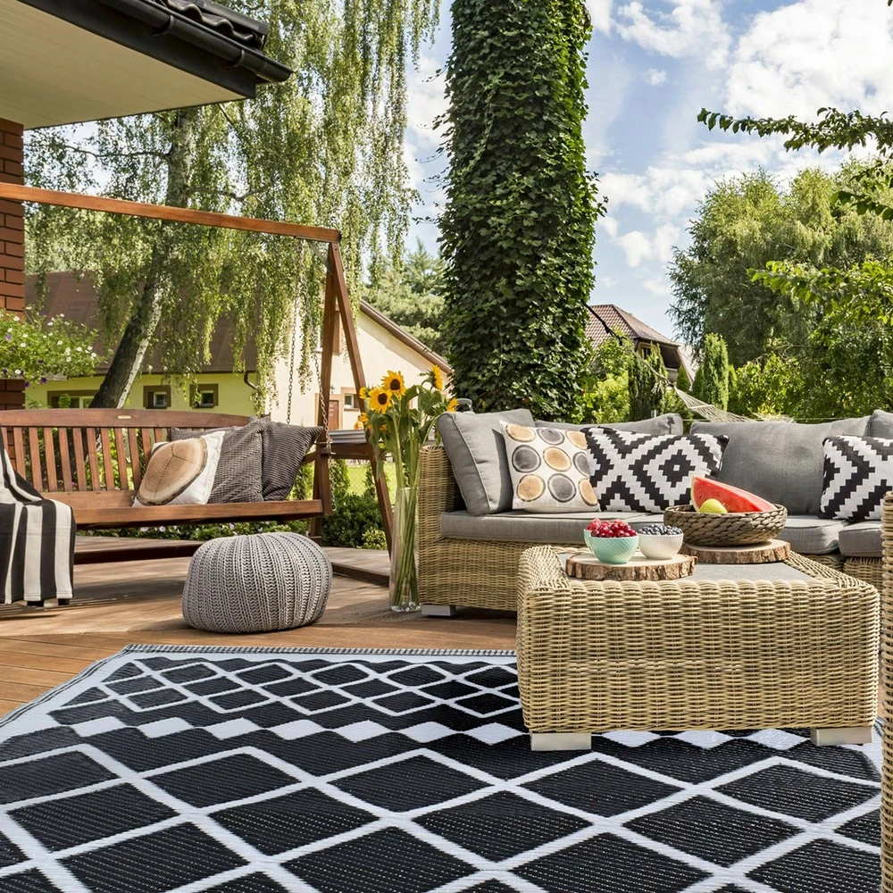 Ce tapis outdoor aux motifs graphiques apportera une note gĂ©omĂ©trique Ă votre extĂ©rieur. . Celui-ci est en plastique tressĂ© recto/verso. . Couleur peps et ensoleillĂ© de quoi donner un air de vacances Ă votre espace outdoor. Jouez avec son style graphique en ajoutant du mobilier en rotin, une lanterne en osier… Avec ce tapis, laissez parler vos envies d’Ă©vasion !. Pendant la saison froide, laissez votre tapis bien au chaud dans un endroit sec. Nos tapis extĂ©rieur en polypropylĂšne sont recyclables, rĂ©sistant aux uv et Ă la pluie.  . CaractĂ©ristiques :. Dimensions : 120 x 160 cm, 150 x 220 cm et 180 x 280 cm             . Coloris : jaune, noir. Composition : 100% polypropylĂšne – 400gr / m2 – rĂ©sistant aux uv.  . Vendu Ă l’unitĂ©.