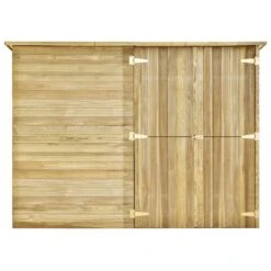 Élargissez vos possibilités de rangement extérieur avec cet abri à vélo en bois. Cet abri est étonnamment spacieux et offre une solution de rangement pour vos vélos. Construit en pin imprégné de qualité, ce hangar est durable et résistant aux intempéries. Son toit est recouvert de feutre asphalté, ce qui le protège contre l’humidité. Grâce à la conception à double porte, ce hangar à vélo est facile d’accès. De plus, le loquet offre une sécurité supplémentaire.